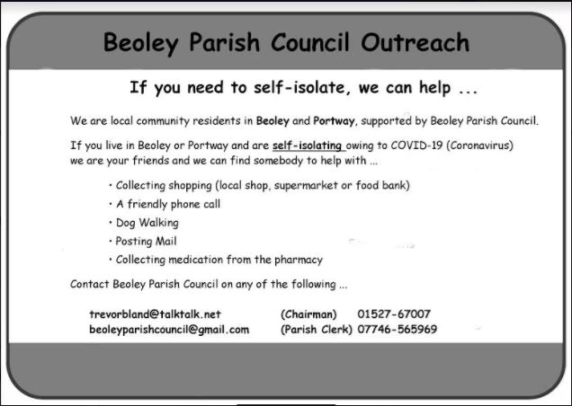 | Beoley Parish | Beoley Parish Council trevorbland@talktalk.bet beoleyparishcouncil@gmail.com Beoley Parish Council 01527 67007 St Leonard’s Church 01527 435683 www.beoleypc.org.uk Click here and here for leaflets | These are the contact details for help and assistance from the Parish Council Community Outreach group. If you have concerns, need help, or just to hear a friendly voice then get in touch. We are here to help you through this crisis. |