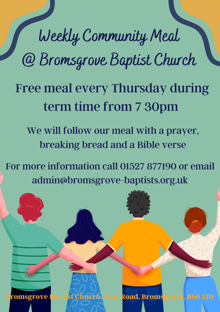 Local residents are being offered a warm welcome and free meal in a friendly environment. The meals are available every Thursday (during term time) at 7:30pm at the Bromsgrove Baptist Church. There is no need to book, you can just turn up, but if it’s a larger group, it would be helpful to let them know in advance. Further information can be found on the attached leaflet.